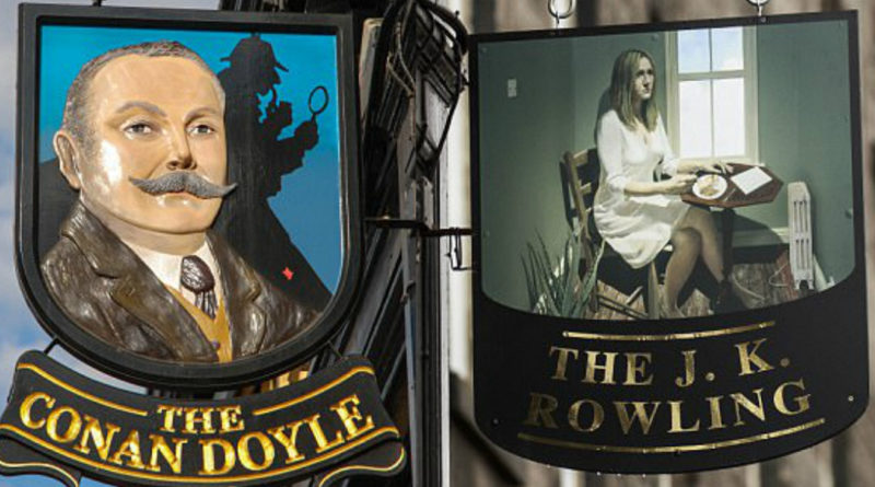 O lugar foi renomeado para “The J.K. Rowling Pub” e, no exterior do bar, a placa com a imagem de Conan Doyle e seu generoso bigode foi substituída por uma JK sentada com as pernas cruzadas, como se estivesse fazendo uma refeição. Rowling nasceu no Reino Unido mas mudou-se para a Escócia em 1993, antes de se tornar mundialmente famosa.